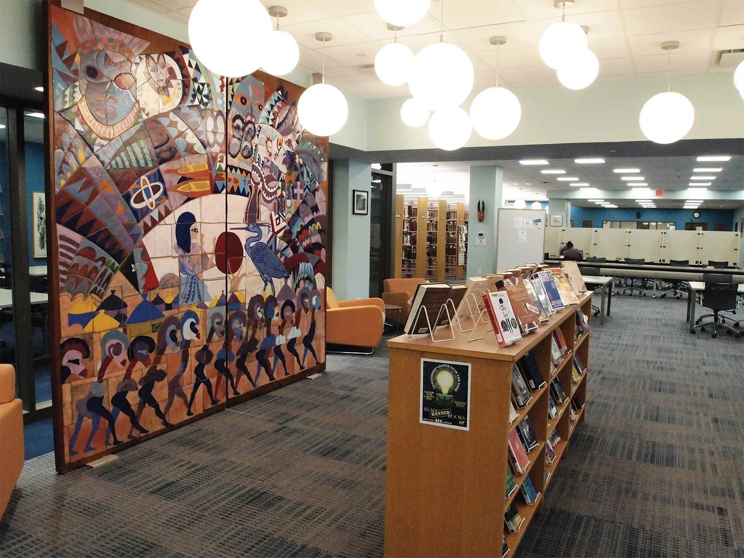 Napoleon Jones-Henderson, Nyame Birbi Wo Soro (1987), Enamel on Copper on Mahogany, 10' x 10' x 3". Roxbury Community College Library, 1400 Tremont St, Boston, MA 02120. Photo credit: Napoleon Jones-Henderson